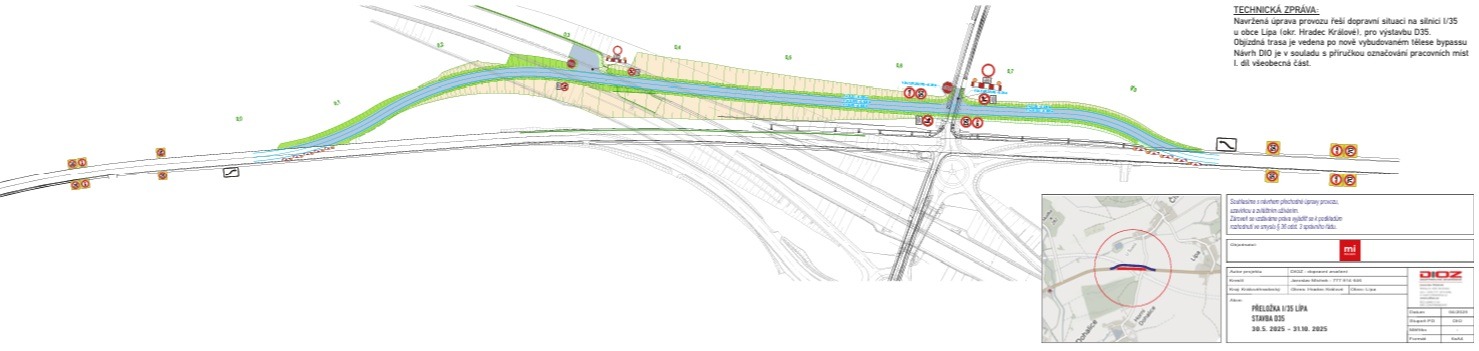 Od sobotního rána dne 31. 5. 2025 musí řidiči při cestě z Hradce Králové do Jičína a opačně počítat s novinkou, která je čeká na silnici I/35. Mezi Lípou a Sadovou dojde k převedení dopravy ze stávající silnice I/35 na nově vybudovanou dočasnou komunikaci (tzv. bypass). Důvodem jsou práce na výstavbě mimoúrovňové křižovatky (MÚK) Sadová v rámci stavby dálničního úseku D35 Sadová-Plotiště. Převedením provozu na přilehlou provizorní silnici se uvolní prostor pro vybudování MÚK. Její součástí budou dvě okružní křižovatky, sjezdová a nájezdová větev a také nadjezd nad budoucí dálnicí. Ten bude právě v části mezi oběma okružními křižovatkami. Stávající těleso silnice I/35 bude trvale odstraněno a silnice I/35 bude přeložena do nové stopy.